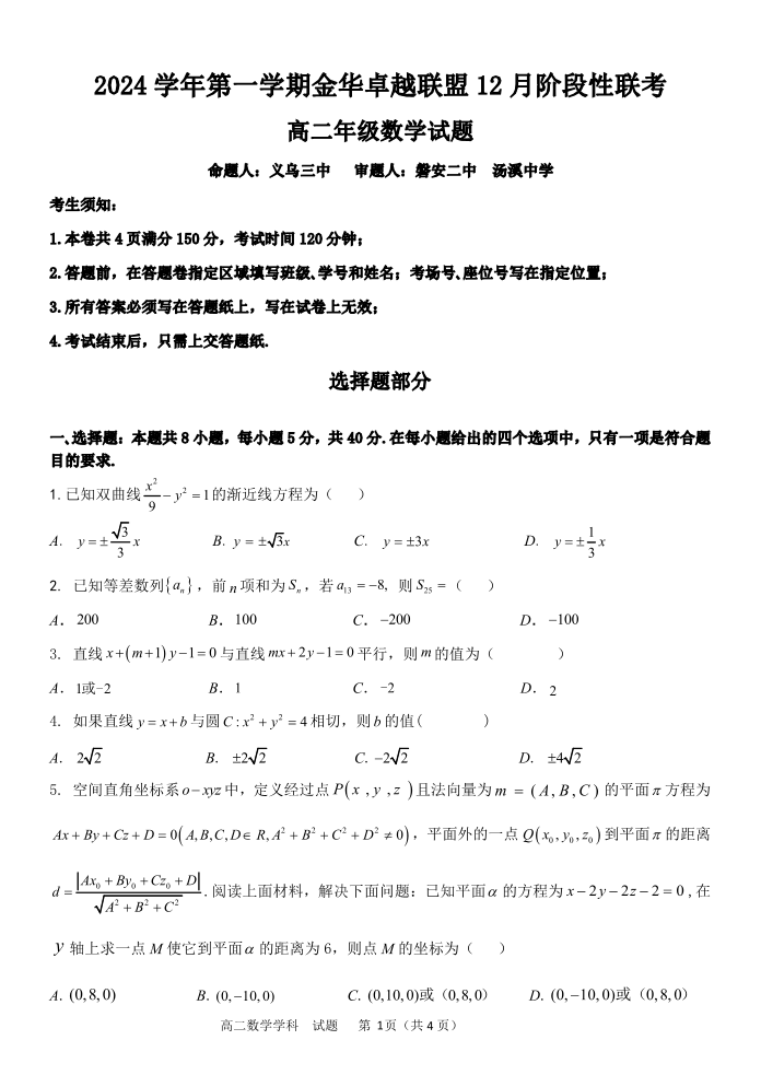 浙江省金华市卓越联盟2024-2025学年高二12月阶段性联考数学