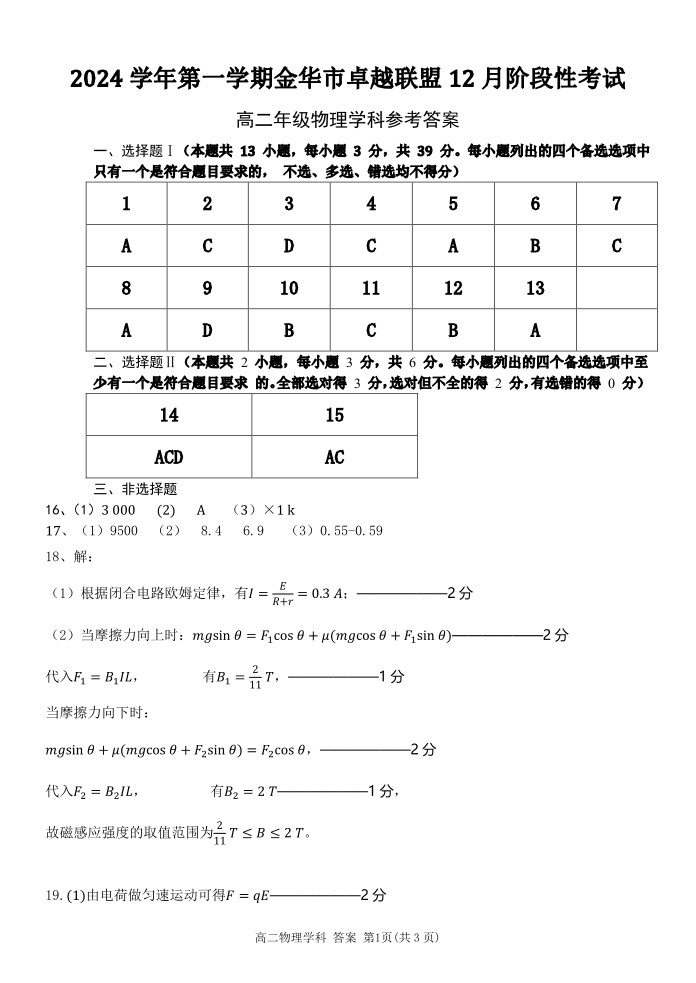浙江省金华市卓越联盟2024-2025学年高二12月阶段性联考物理答案