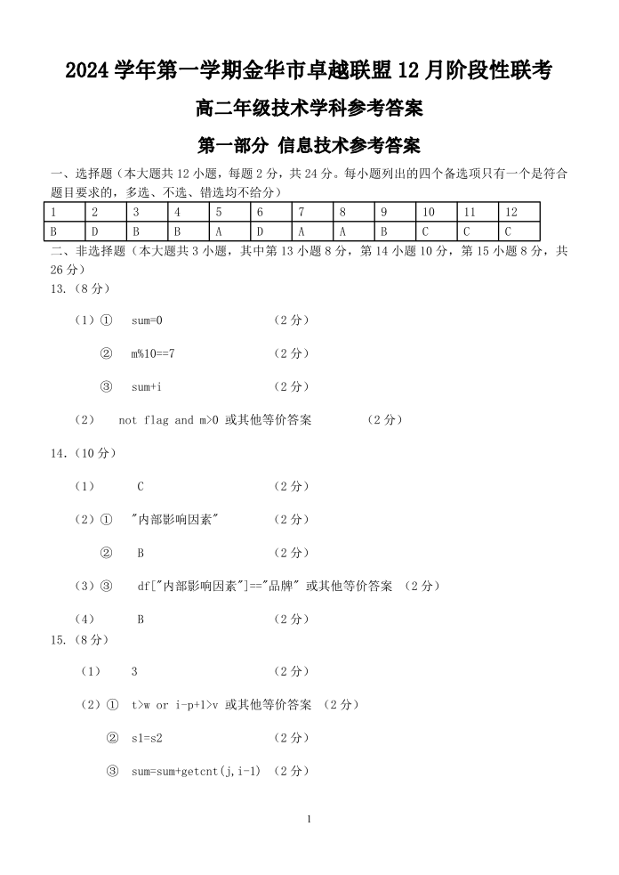 浙江省金华市卓越联盟2024-2025学年高二12月阶段性联考技术答案