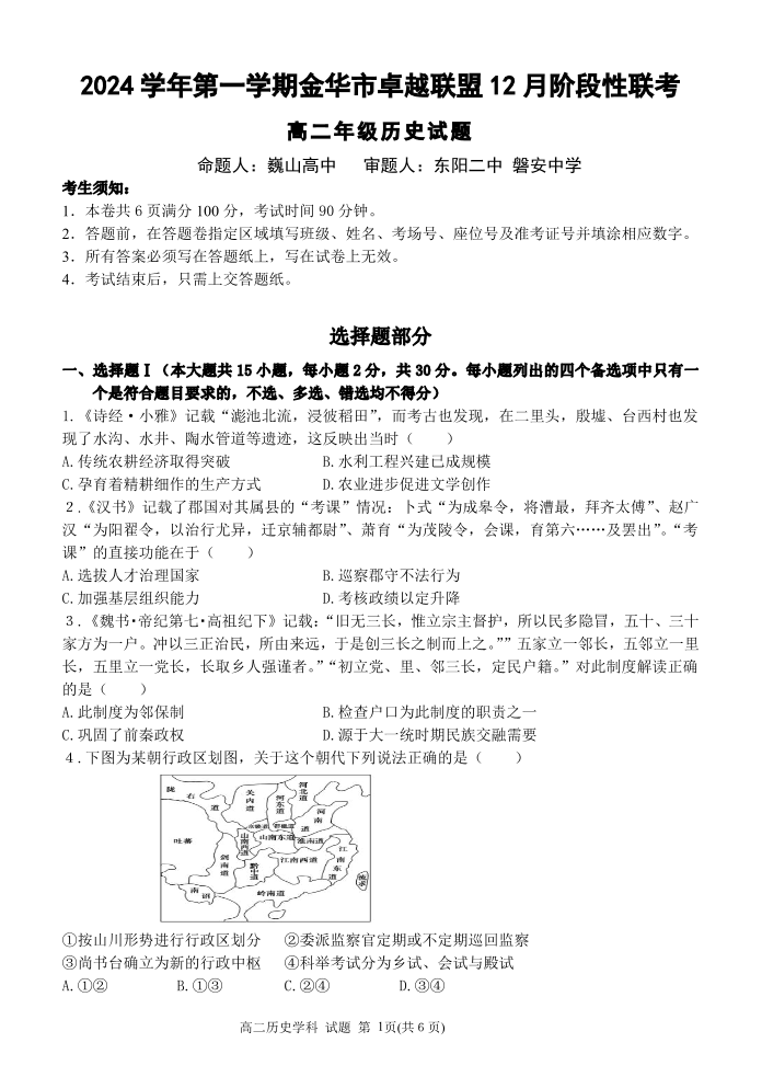 浙江省金华市卓越联盟2024-2025学年高二12月阶段性联考历史