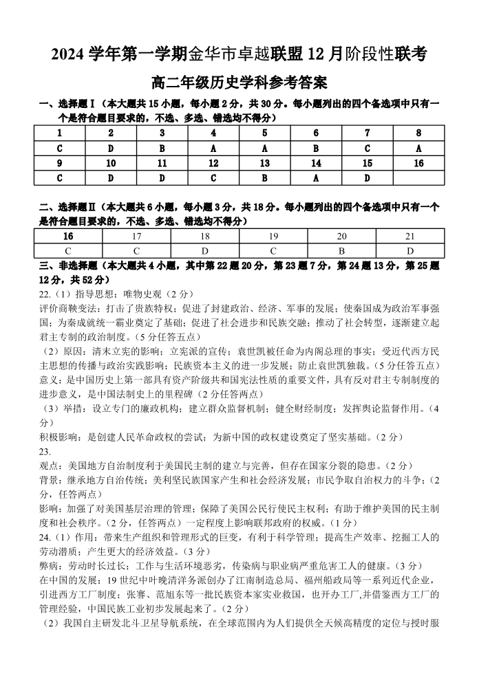 浙江省金华市卓越联盟2024-2025学年高二12月阶段性联考历史答案