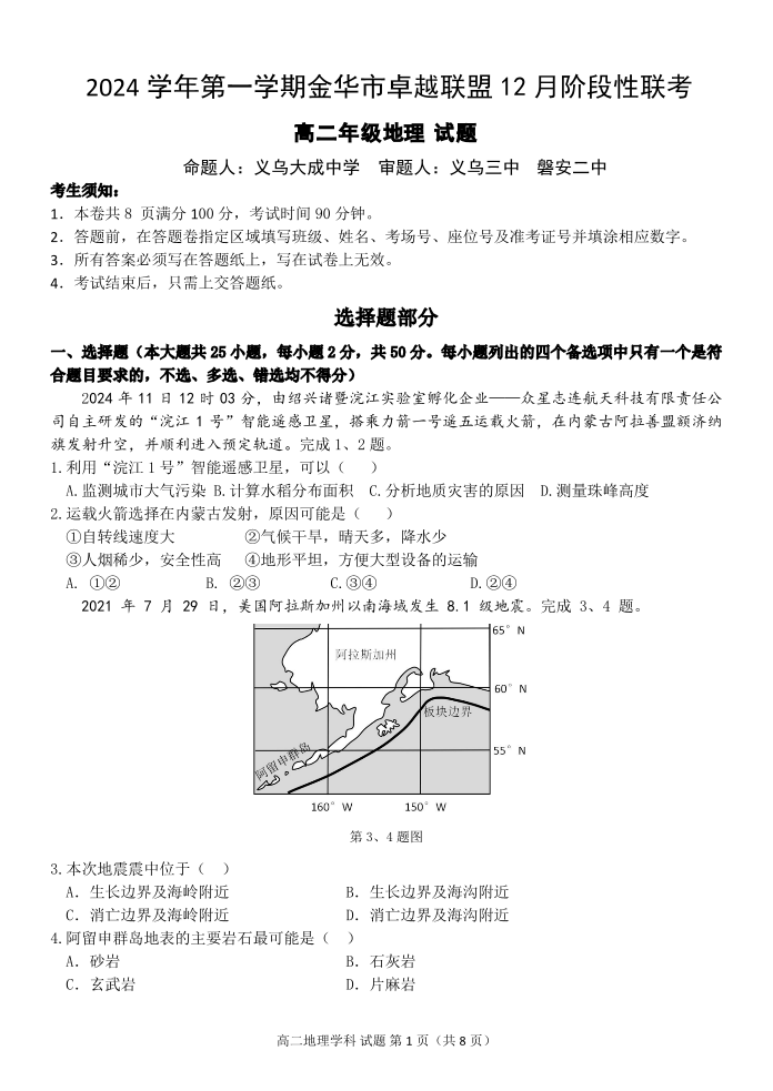 浙江省金华市卓越联盟2024-2025学年高二12月阶段性联考地理