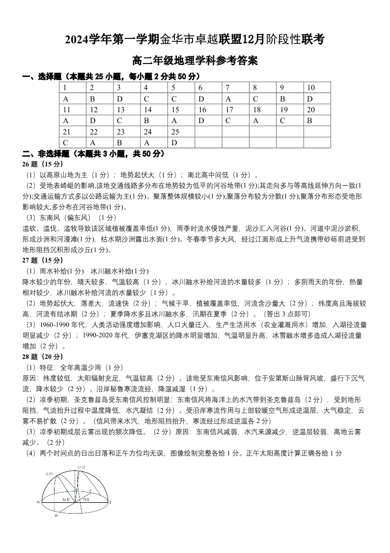 浙江省金华市卓越联盟2024-2025学年高二12月阶段性联考地理答案