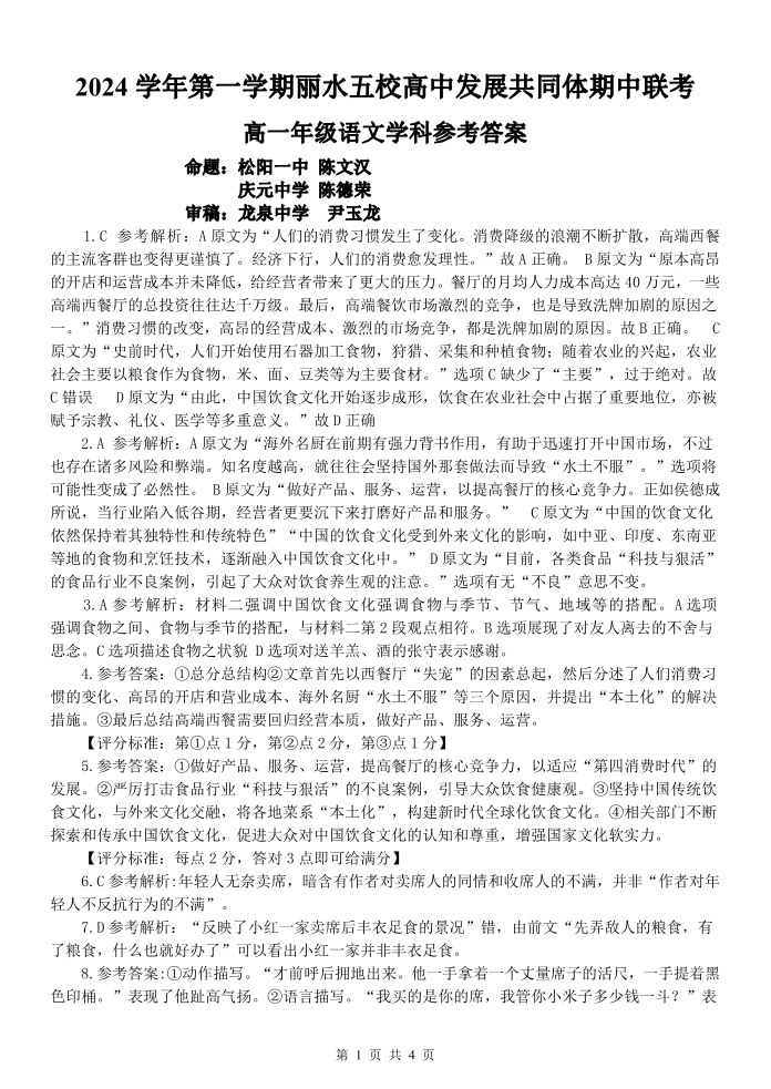 浙江省丽水五校高中发展共同体2024年上学期高一期中联考语文答案