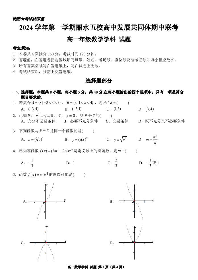 浙江省丽水五校高中发展共同体2024年上学期高一期中联考数学