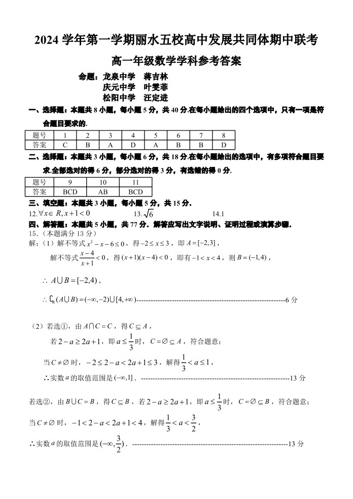 浙江省丽水五校高中发展共同体2024年上学期高一期中联考数学答案