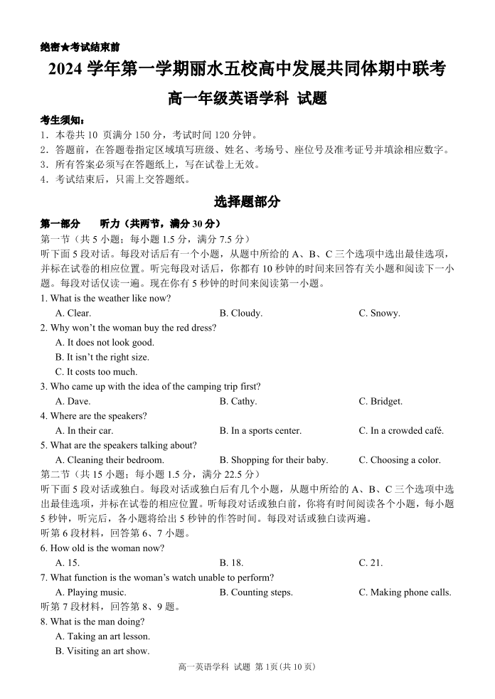 浙江省丽水五校高中发展共同体2024年上学期高一期中联考英语