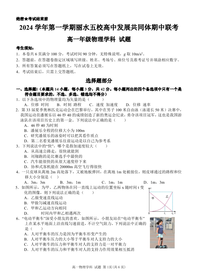 浙江省丽水五校高中发展共同体2024年上学期高一期中联考物理