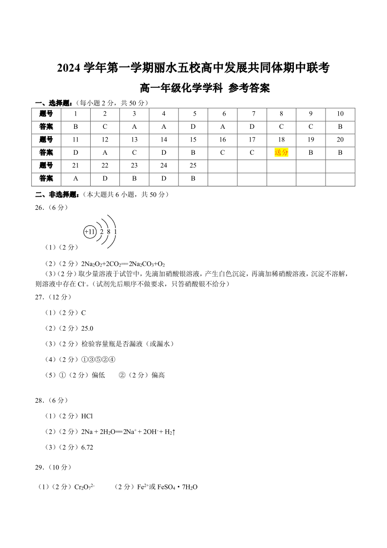 浙江省丽水五校高中发展共同体2024年上学期高一期中联考化学答案