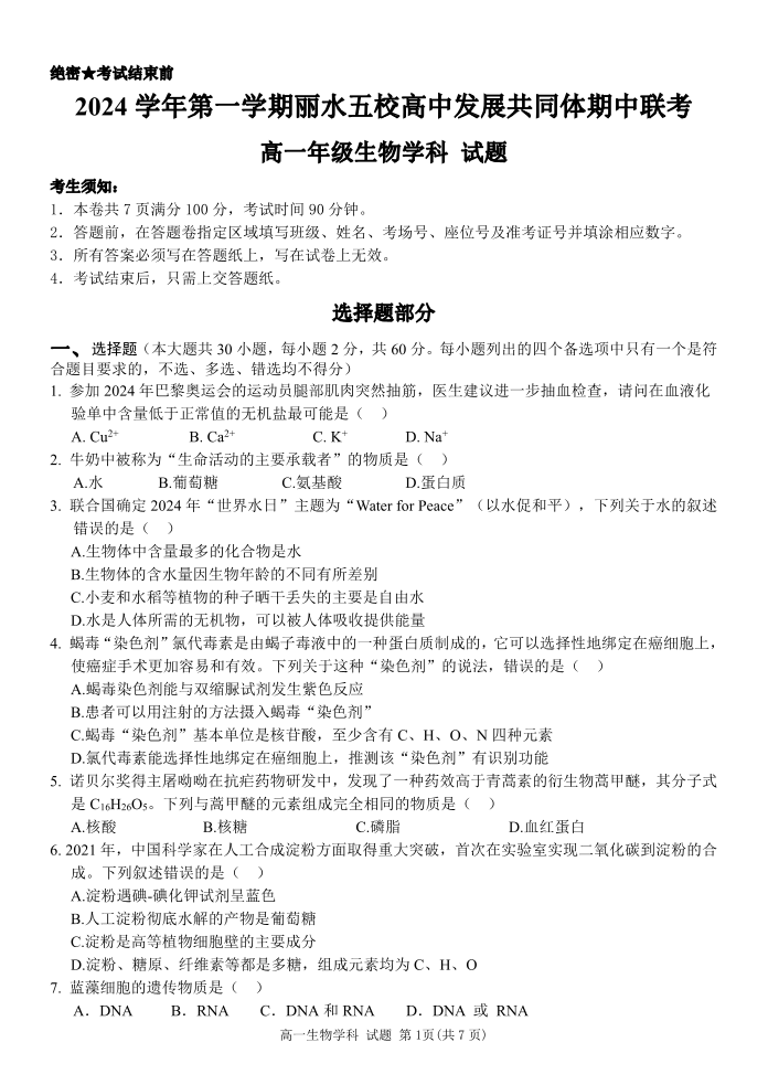 浙江省丽水五校高中发展共同体2024年上学期高一期中联考生物