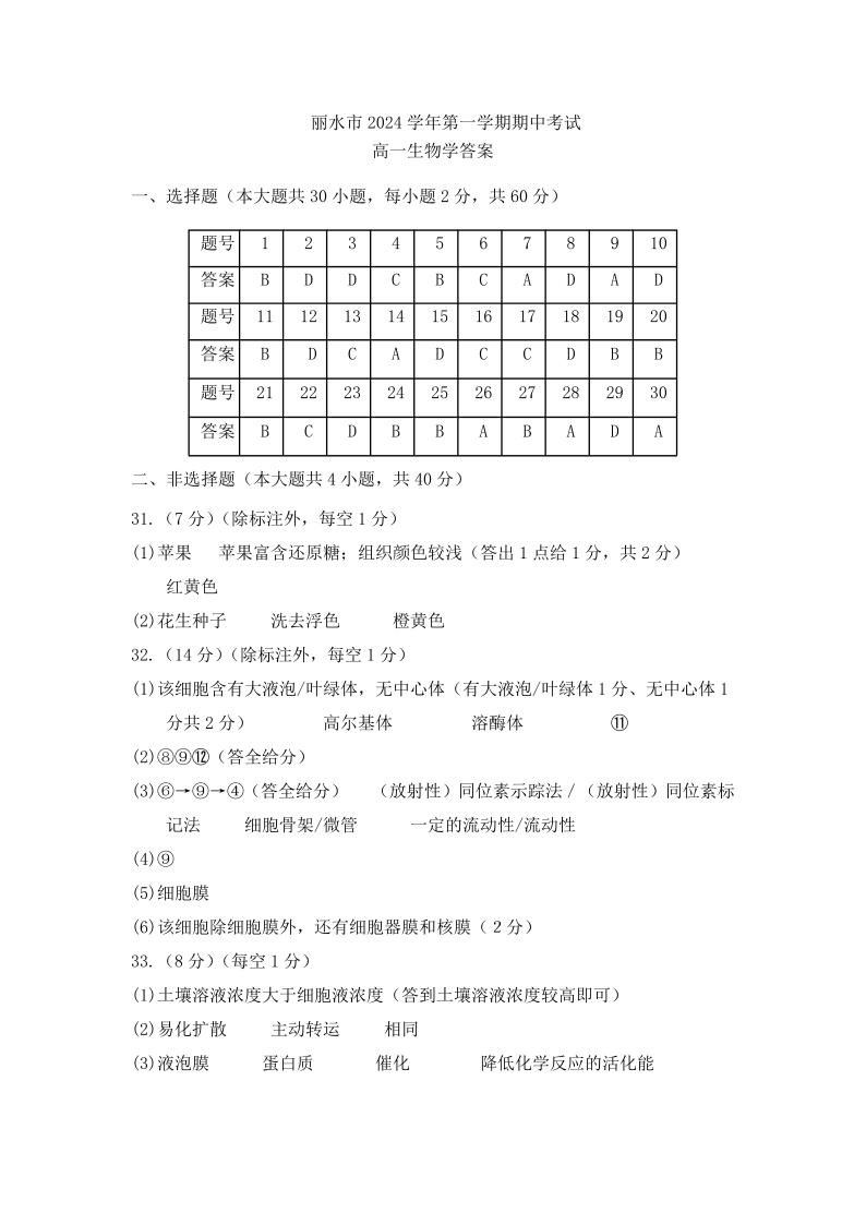 浙江省丽水五校高中发展共同体2024年上学期高一期中联考生物答案