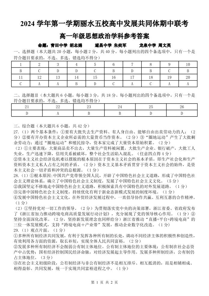 浙江省丽水五校高中发展共同体2024年上学期高一期中联考政治答案