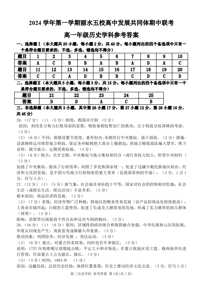 浙江省丽水五校高中发展共同体2024年上学期高一期中联考历史答案