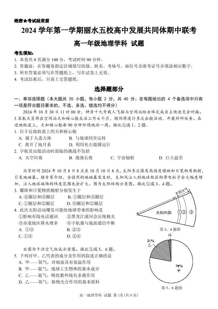 浙江省丽水五校高中发展共同体2024年上学期高一期中联考地理