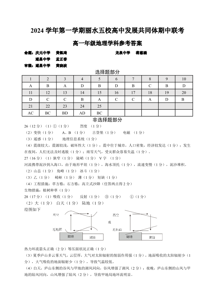 浙江省丽水五校高中发展共同体2024年上学期高一期中联考地理答案