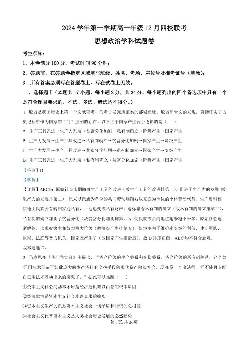 浙江省区域四校2024-2025学年上学期高一年级12月月考政治(精品解析版)