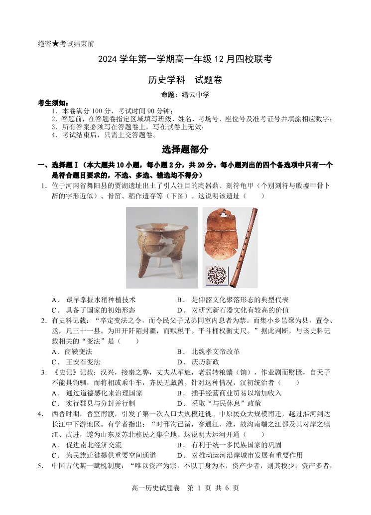 浙江省区域四校2024-2025学年上学期高一年级12月月考历史