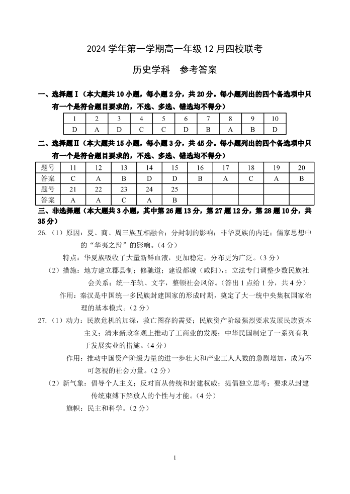 浙江省区域四校2024-2025学年上学期高一年级12月月考历史答案