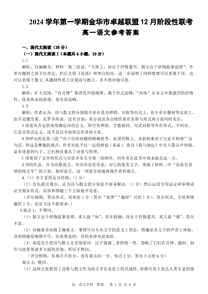 浙江省金华市卓越联盟2024-2025学年高一上学期12月阶段性联考语文答案