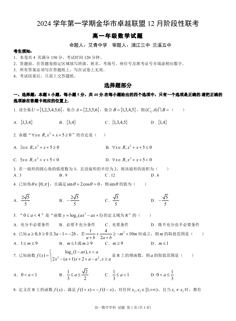 浙江省金华市卓越联盟2024-2025学年高一上学期12月阶段性联考数学
