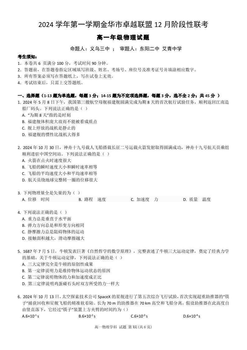 浙江省金华市卓越联盟2024-2025学年高一上学期12月阶段性联考物理