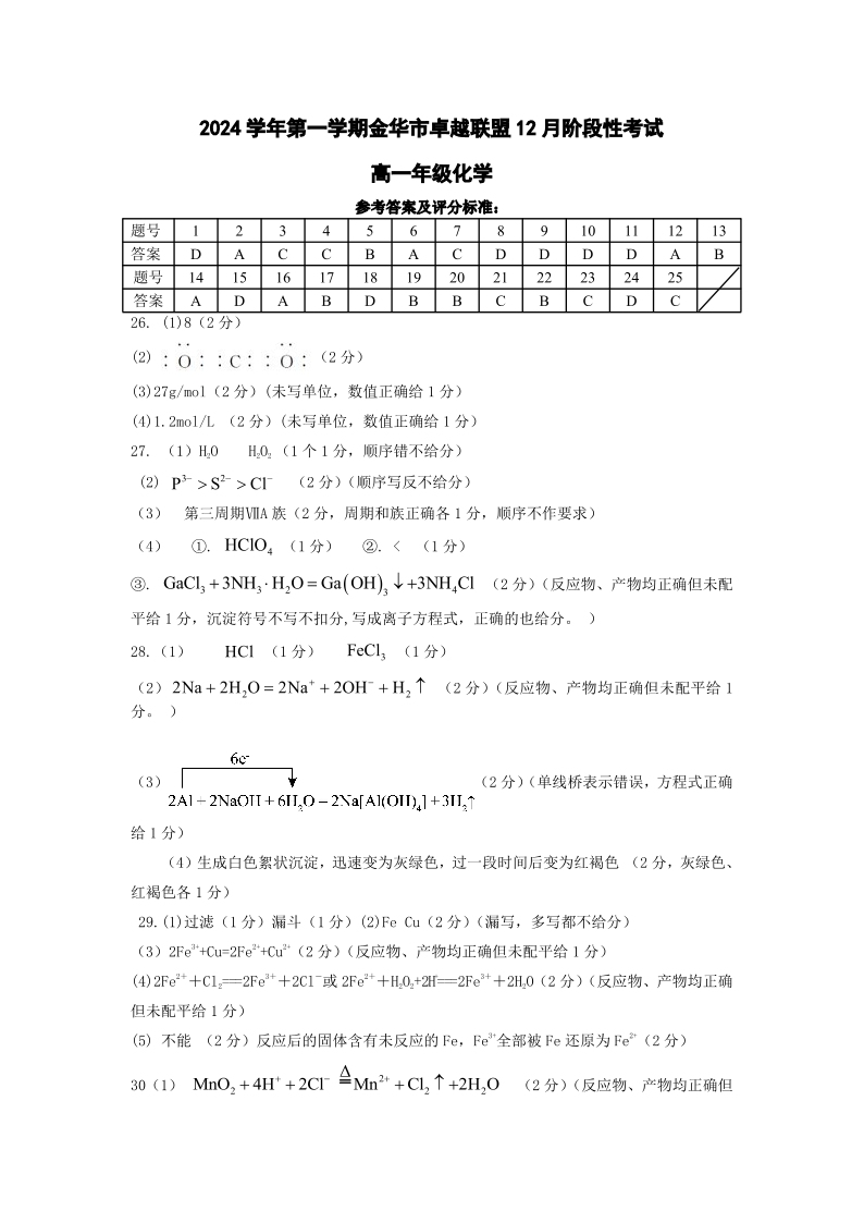 浙江省金华市卓越联盟2024-2025学年高一上学期12月阶段性联考化学答案
