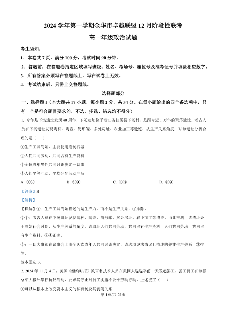浙江省金华市卓越联盟2024-2025学年高一上学期12月阶段性联考政治(精品解析版)