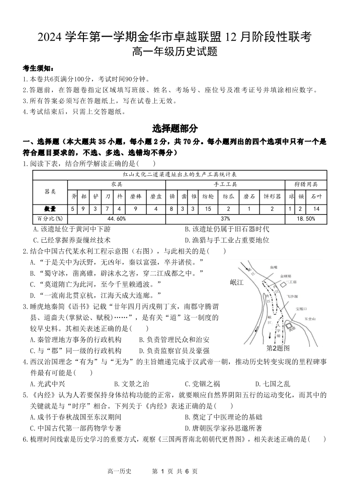 浙江省金华市卓越联盟2024-2025学年高一上学期12月阶段性联考历史