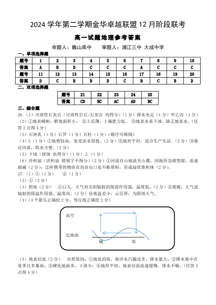 浙江省金华市卓越联盟2024-2025学年高一上学期12月阶段性联考地理答案