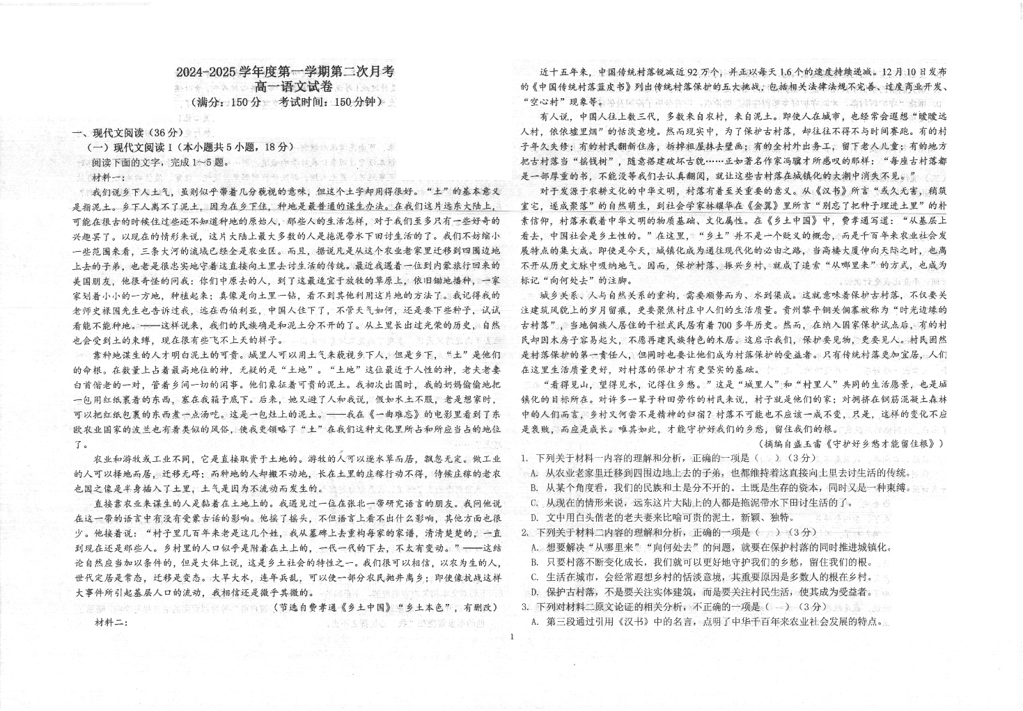 陕西省汉中市二中类校2024-2025学年高二上学期12月月考语文+答案解析