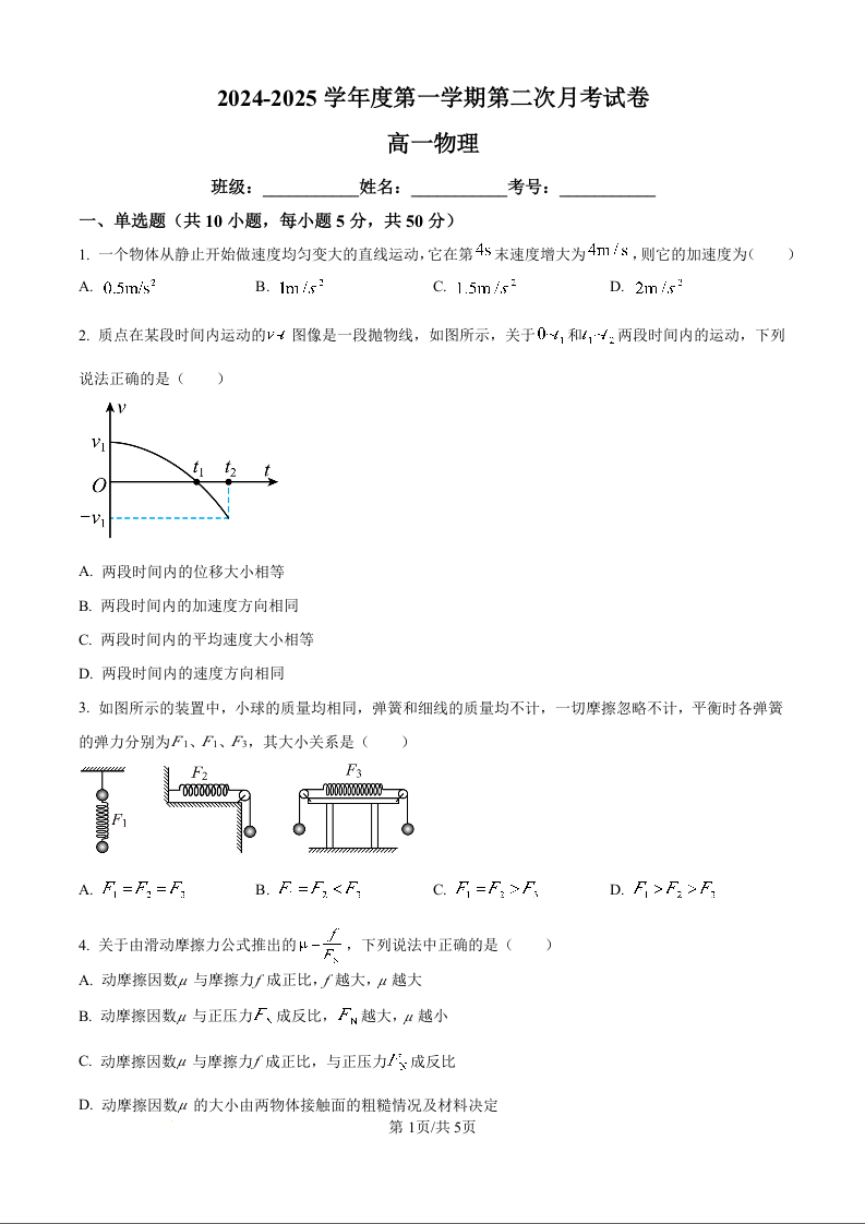 陕西省汉中市二中类校2024-2025学年高一上学期12月月考物理(原卷版)