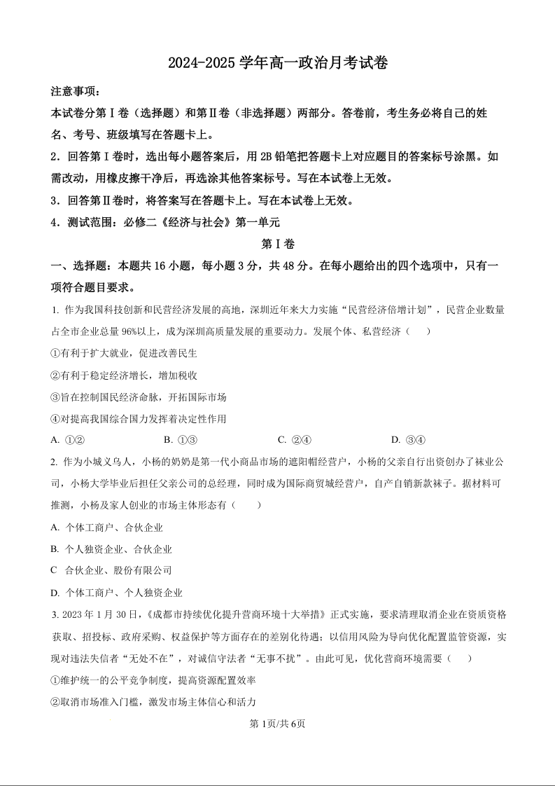 陕西省汉中市二中类校2024-2025学年高一上学期12月月考政治(原卷版)