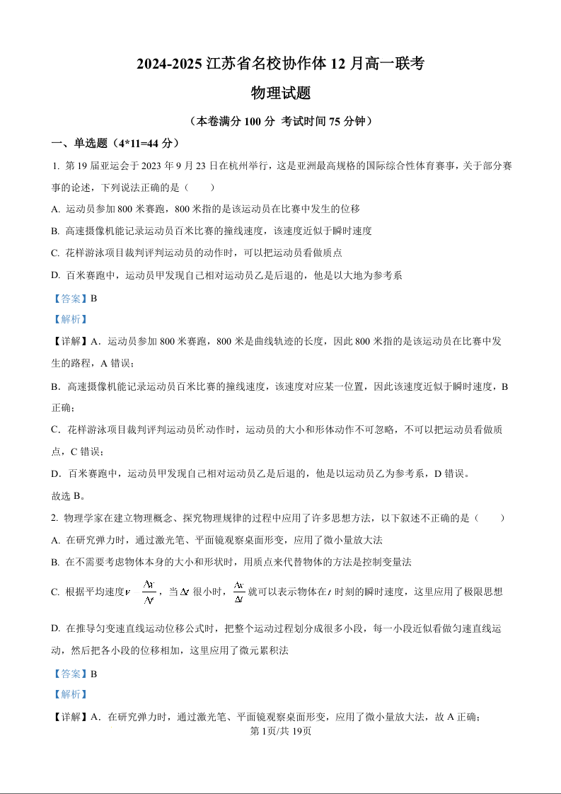 江苏省名校协作体2024-2025学年高一上学期12月月考物理(精品解析版)