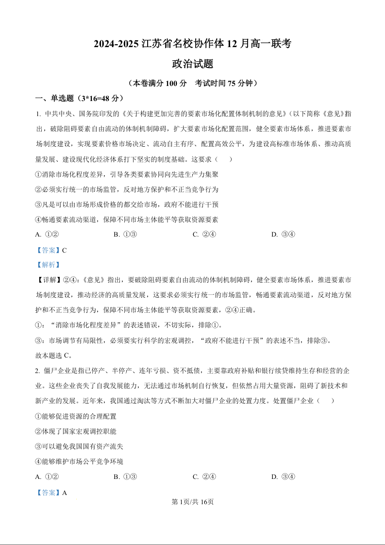 江苏省名校协作体2024-2025学年高一上学期12月月考政治(精品解析版)