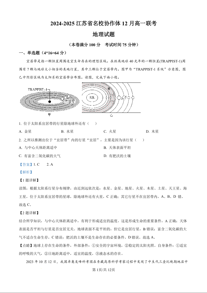 江苏省名校协作体2024-2025学年高一上学期12月月考地理(精品解析版)