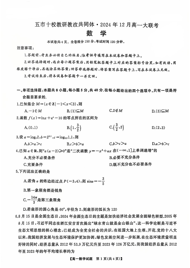湖南省五市十校教研教改共同体2024-2025学年高一上学期12月月考数学