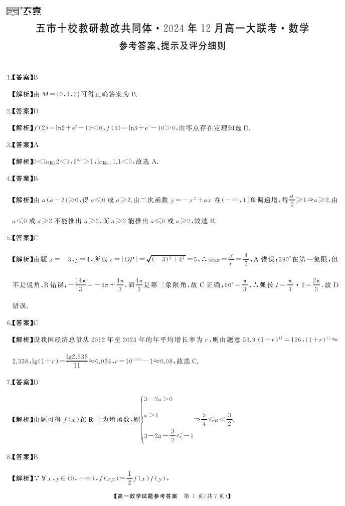 湖南省五市十校教研教改共同体2024-2025学年高一上学期12月月考数学答案