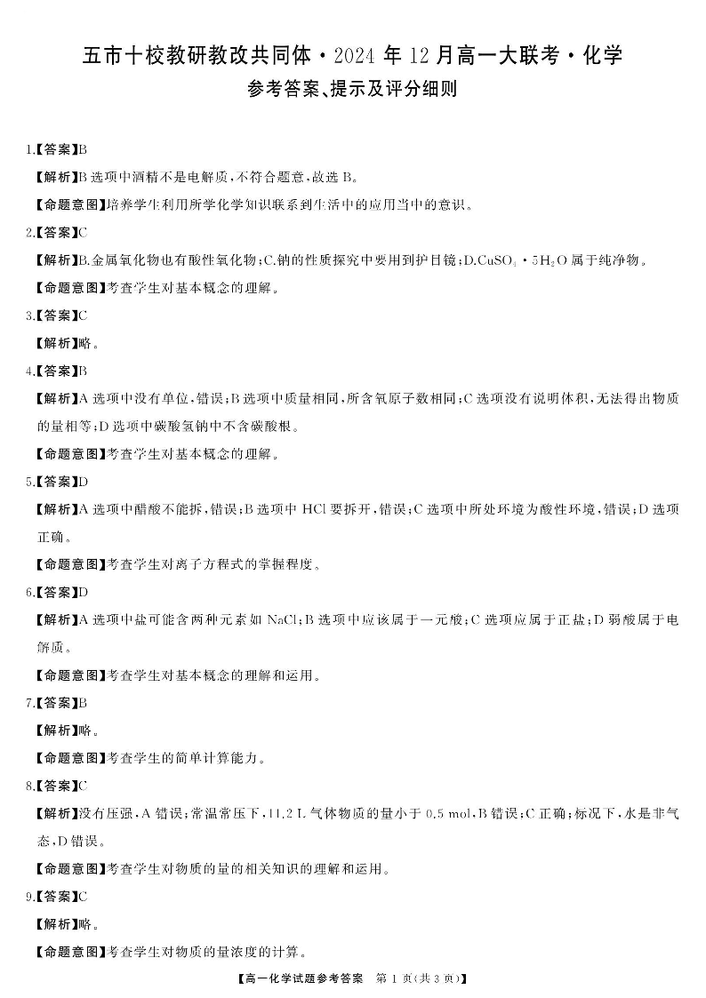 湖南省五市十校教研教改共同体2024-2025学年高一上学期12月月考化学答案.pdf