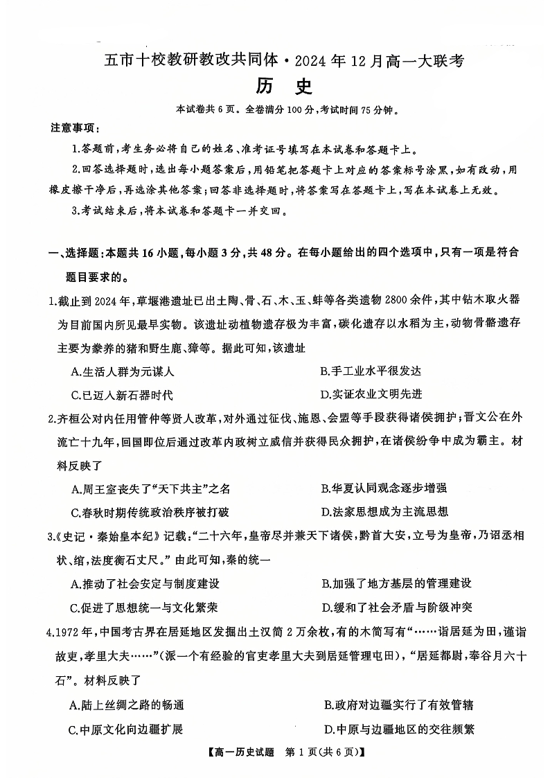 湖南省五市十校教研教改共同体2024-2025学年高一上学期12月月考历史