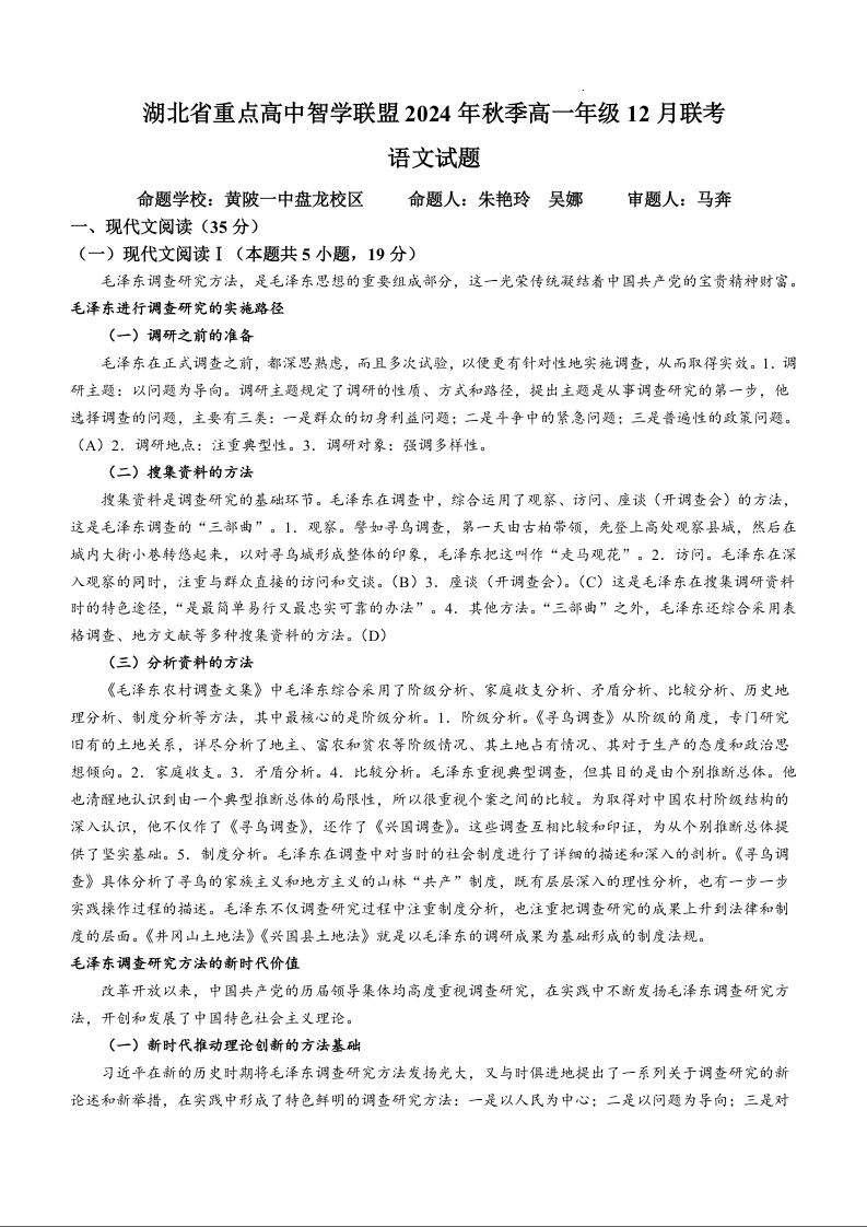 湖北省重点高中智学联盟2024-2025学年高一上学期12月月考试题语文+答案解析