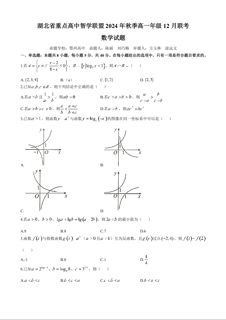 湖北省重点高中智学联盟2024-2025学年高一上学期12月月考试题数学