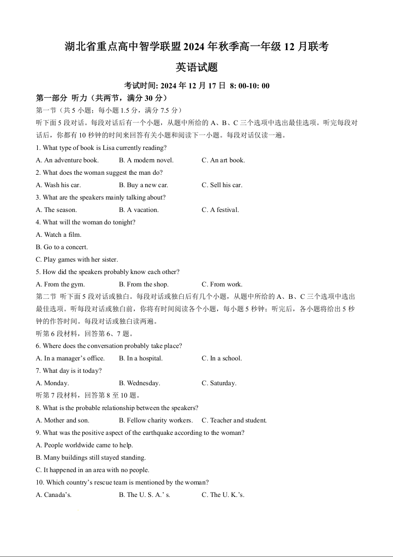 湖北省重点高中智学联盟2024-2025学年高一上学期12月月考试题英语+答案解析