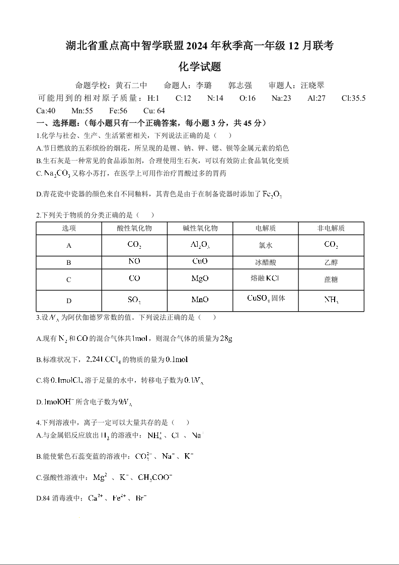 湖北省重点高中智学联盟2024-2025学年高一上学期12月月考试题化学+答案解析