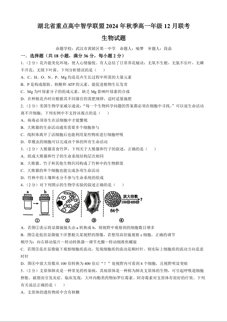 湖北省重点高中智学联盟2024-2025学年高一上学期12月月考试题生物+答案解析