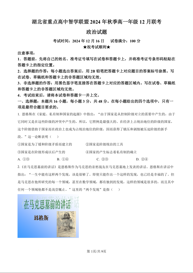 湖北省重点高中智学联盟2024-2025学年高一上学期12月月考试题政治(原卷版)