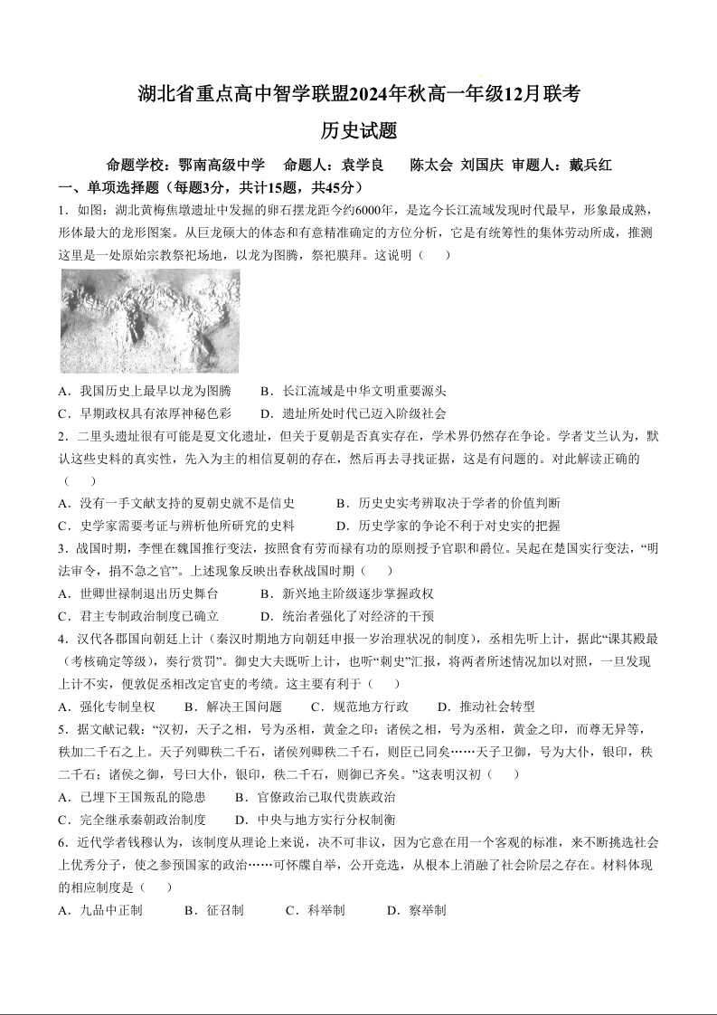 湖北省重点高中智学联盟2024-2025学年高一上学期12月月考试题历史+答案解析