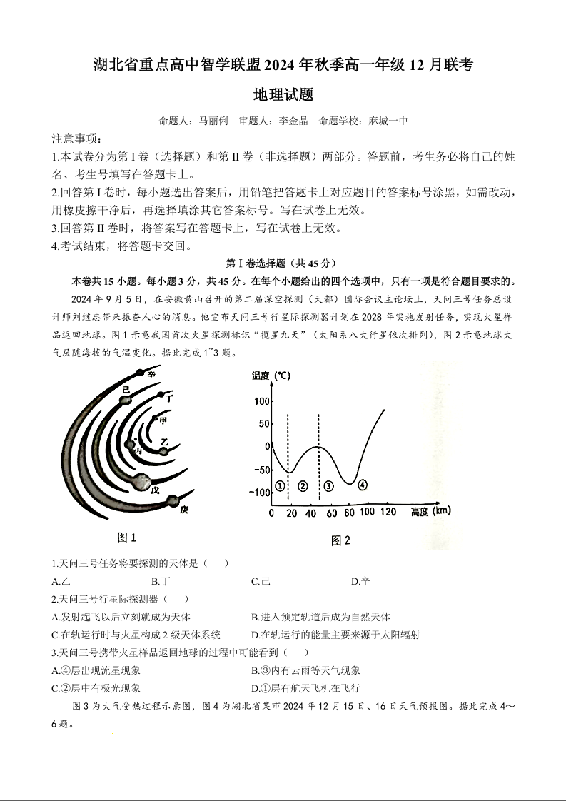 湖北省重点高中智学联盟2024-2025学年高一上学期12月月考试题地理+答案解析