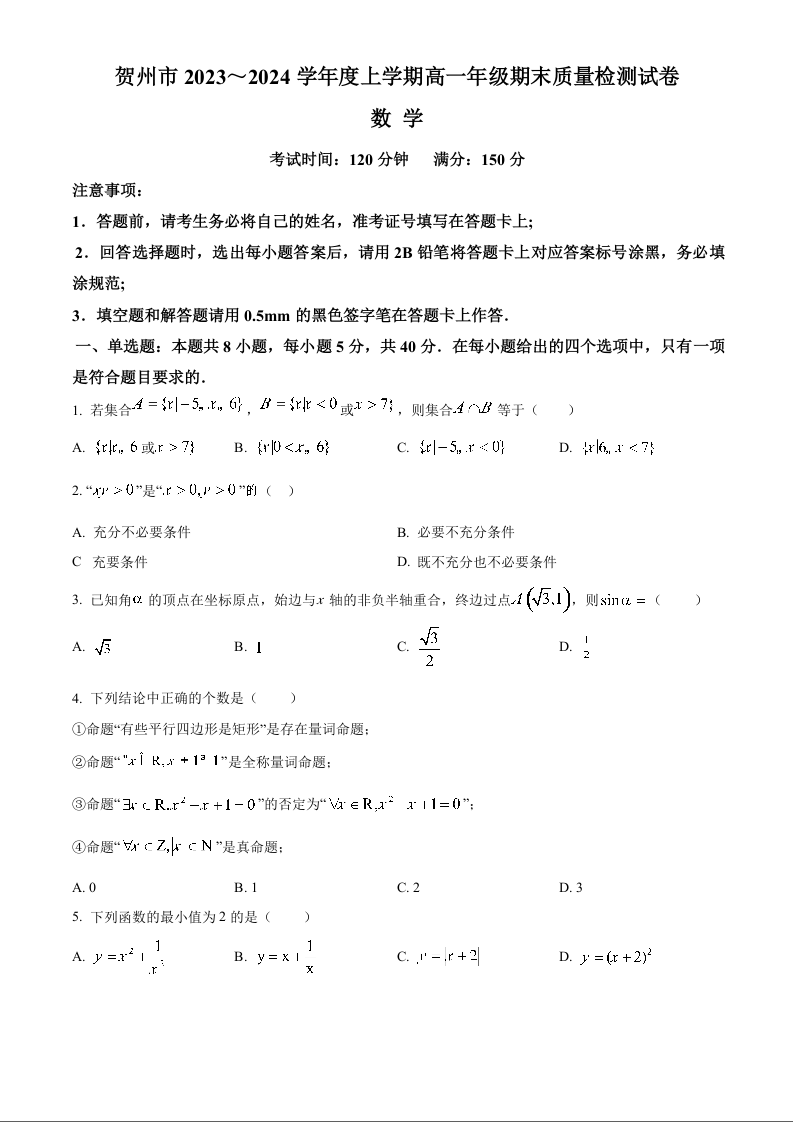 广西壮族自治区贺州市2023-2024学年高一上学期期末考试数学(原卷版)