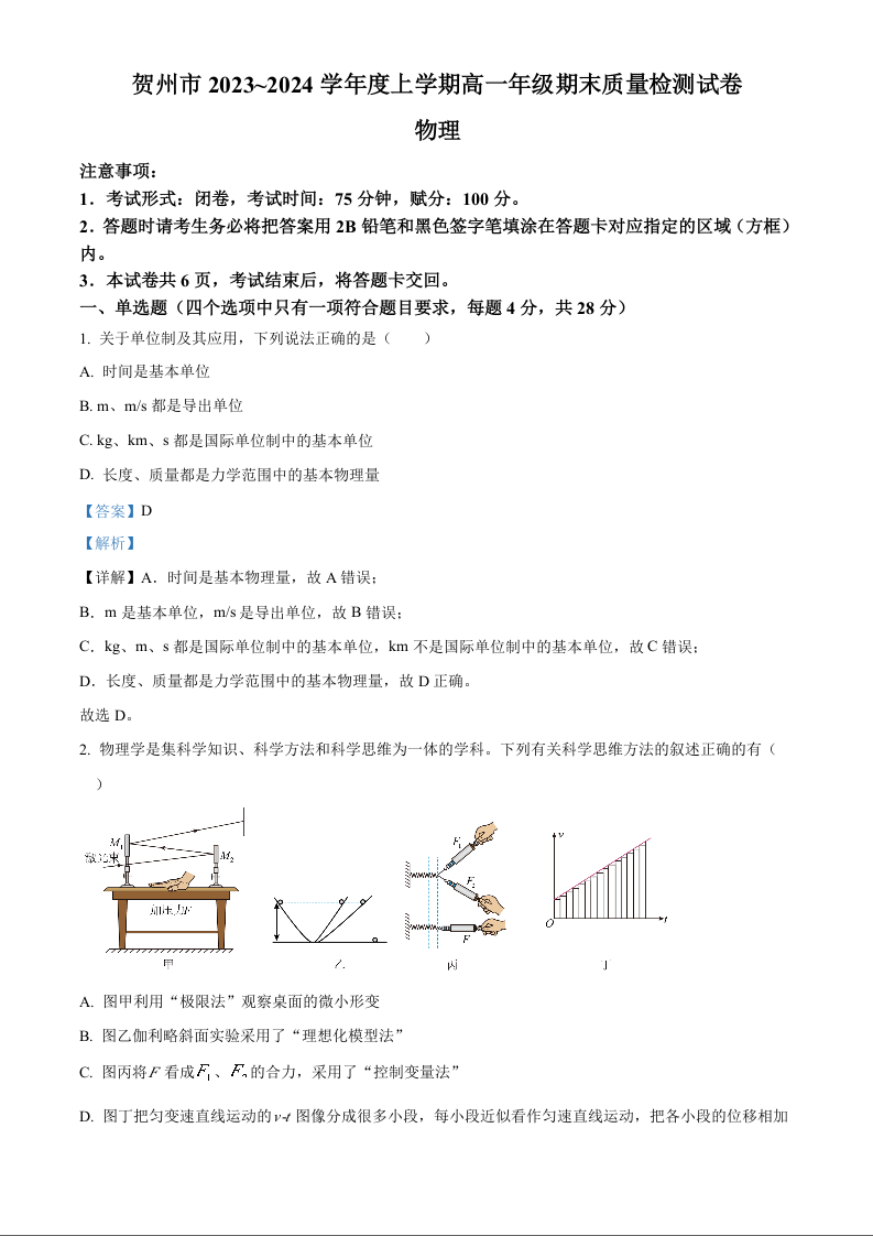 广西壮族自治区贺州市2023-2024学年高一上学期期末考试物理(解析版)