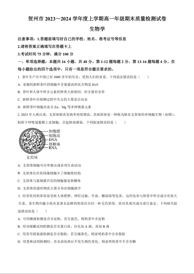 广西壮族自治区贺州市2023-2024学年高一上学期期末考试生物(原卷版)